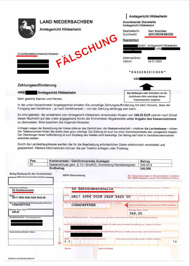 Bei den falschen Anschreiben handelt es sich unter anderem um Zahlungsaufforderungen in Registerangelegenheiten, die unter dem Absender „ZS Zahldienststelle Amtsgericht Hildesheim“ bei den Unternehmen eingehen. Auf dem beigefügten Überweisungsträger ist ebenfalls als Empfänger eine „ZS Zahldienststelle“ eingetragen, eine derartige Bezeichnung verwendet das Amtsgericht Hildesheim jedoch nicht. Darüber hinaus wird für die Rufnummer des Sachbearbeiters eine auswärtige Vorwahl (z.B. 0211 für Düsseldorf) verwendet. Ein Beispiel für eine gefälschte Kostenrechnung ist dieser Pressemitteilung zur Ansicht beigefügt.